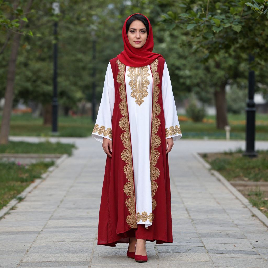 Kurdish Clothes Female Costume, a woman in a red and white outfit standing on a stone walkway
