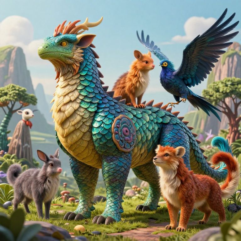 Unique animal generator concept with vivid colors, blending features of rare species and mythical creatures, set in a surreal natural landscape, detailed textures highlighting scales, fur, and feathers, ultra-realistic, fantasy art style.