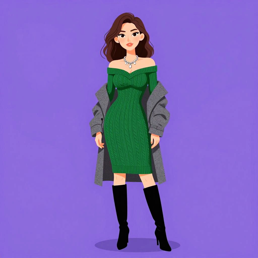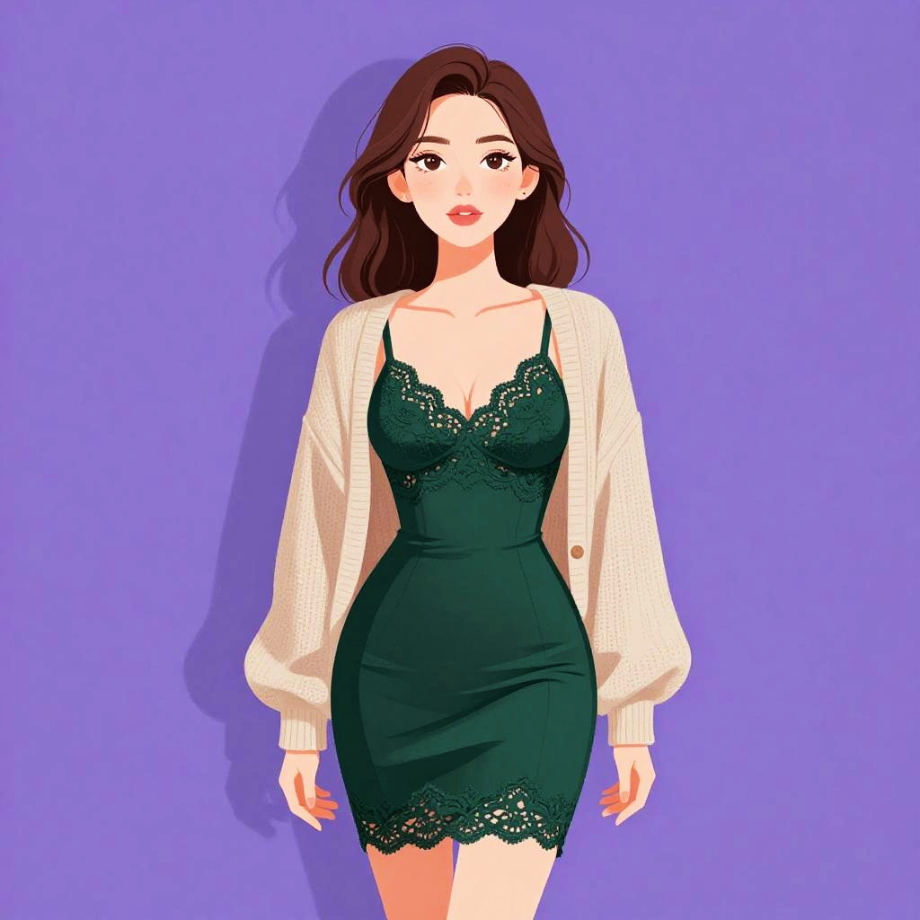 Woman with pretty face and pretty hair. Bodycon dress, sleek silhouette, stretchy cotton blend, deep emerald green, off-shoulder neckline, intricate lace detailing, paired with strappy nude sandals, stiletto heels, minimalist design, delicate ankle straps. --sref 1461