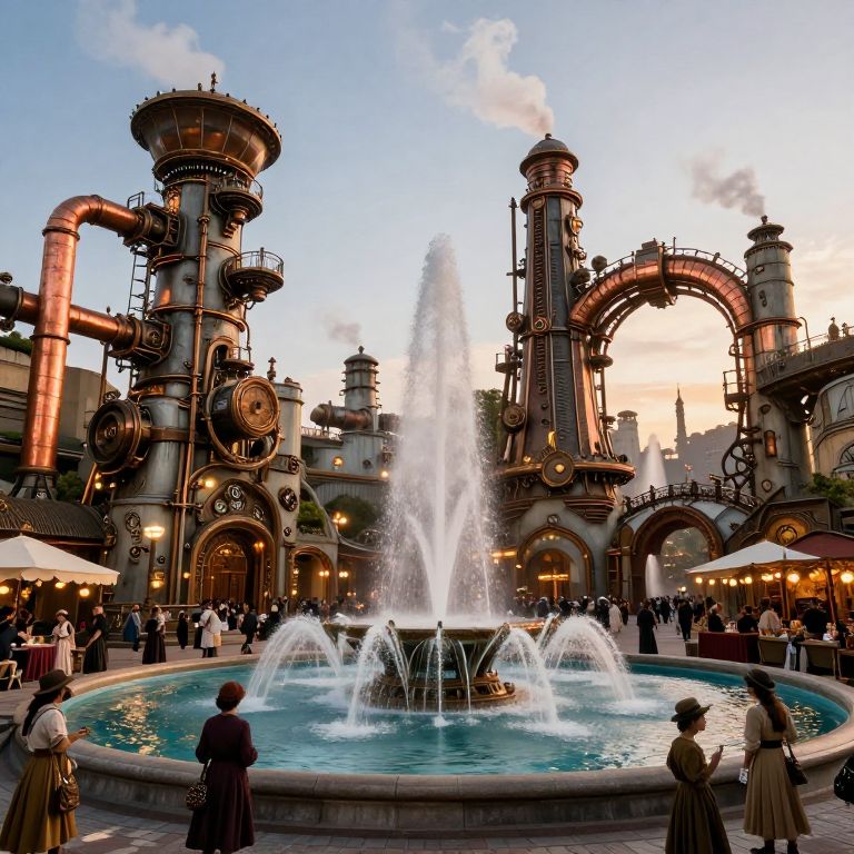 Photograph of a steampunk-style fountain plaza at sunset, with intricate mechanical towers, arched structures, water jets, and people in Victorian attire