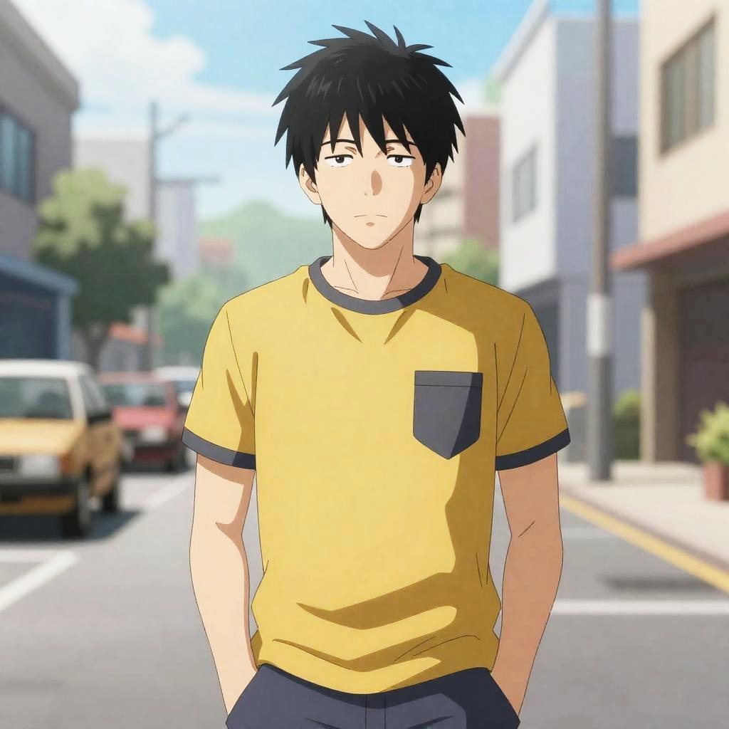 One Punch Man Adult, man in a yellow and grey shirt standing in a street