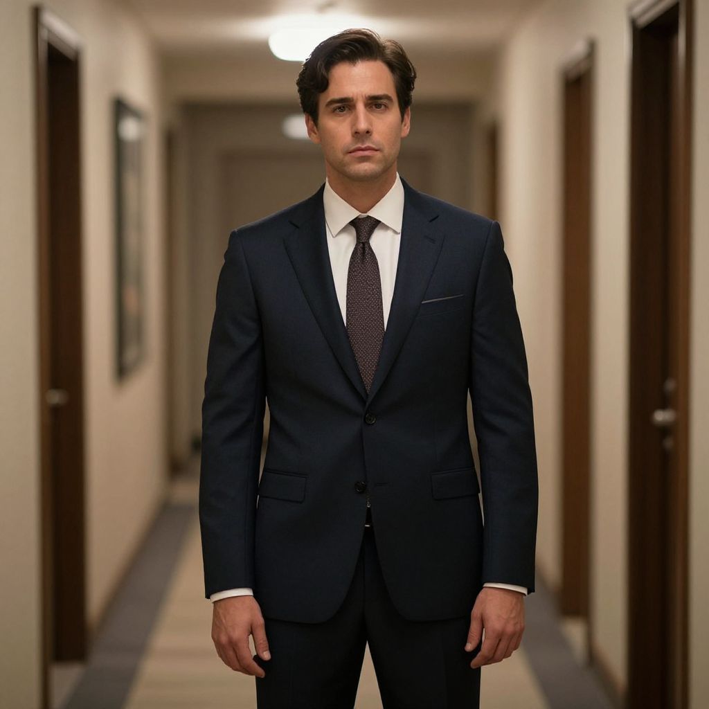 Photograph of a young Caucasian man with short, dark brown hair and fair skin standing in a dimly lit, narrow hallway with beige walls and dark wooden doors on both sides. He is wearing a dark navy blue suit with a white dress shirt and a patterned dark tie. His expression is serious and slightly neutral, with his hands hanging by his sides. The hallway has a striped carpet and a single overhead light fixture at the far end, creating a focused light on the subject. The overall setting suggests a formal or professional environment.
