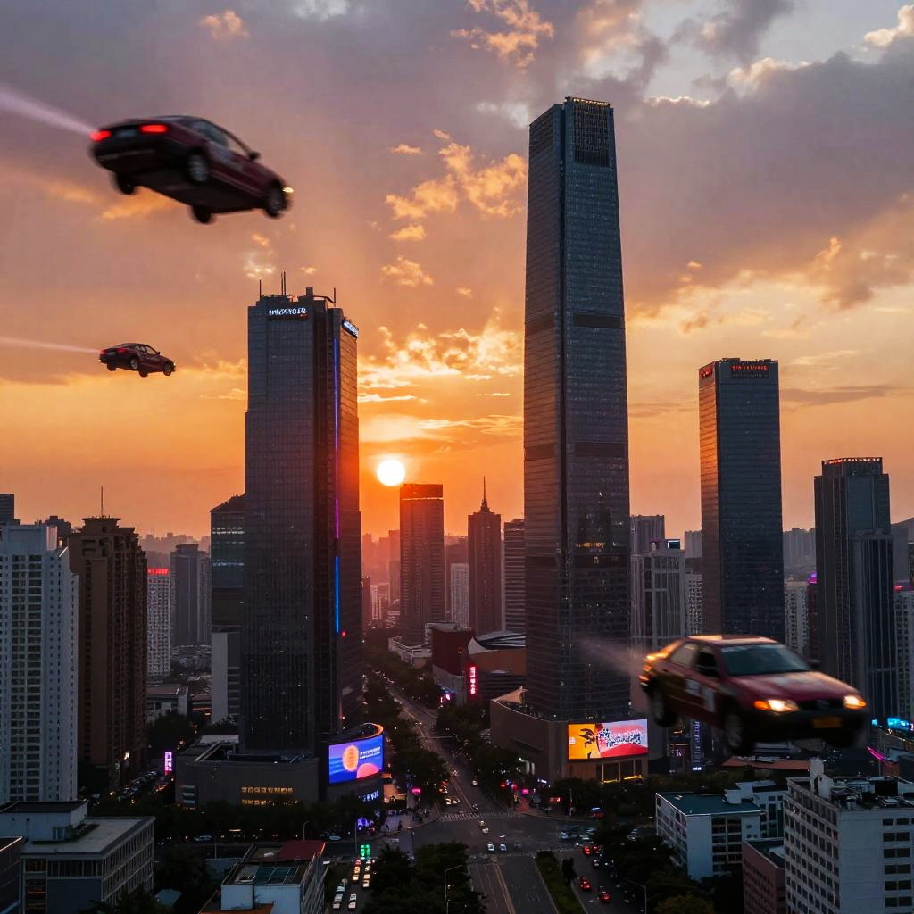 Sunset:ciaydtmudhg= in a futuristic cityscape, glowing skyscrapers reflecting the fiery sky, flying cars casting dynamic shadows, neon lights blending with the sunset hues, a bustling urban environment with a sci-fi vibe, detailed and atmospheric