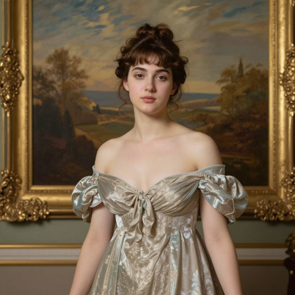 A classical portrait rendered in a high-definition, realistic style reminiscent of William-Adolphe Bouguereau, featuring a woman in an elegant off-the-shoulder gown with puff sleeves, set against a backdrop of a framed landscape painting and ornate gold detailing, evoking a timeless and refined aesthetic.