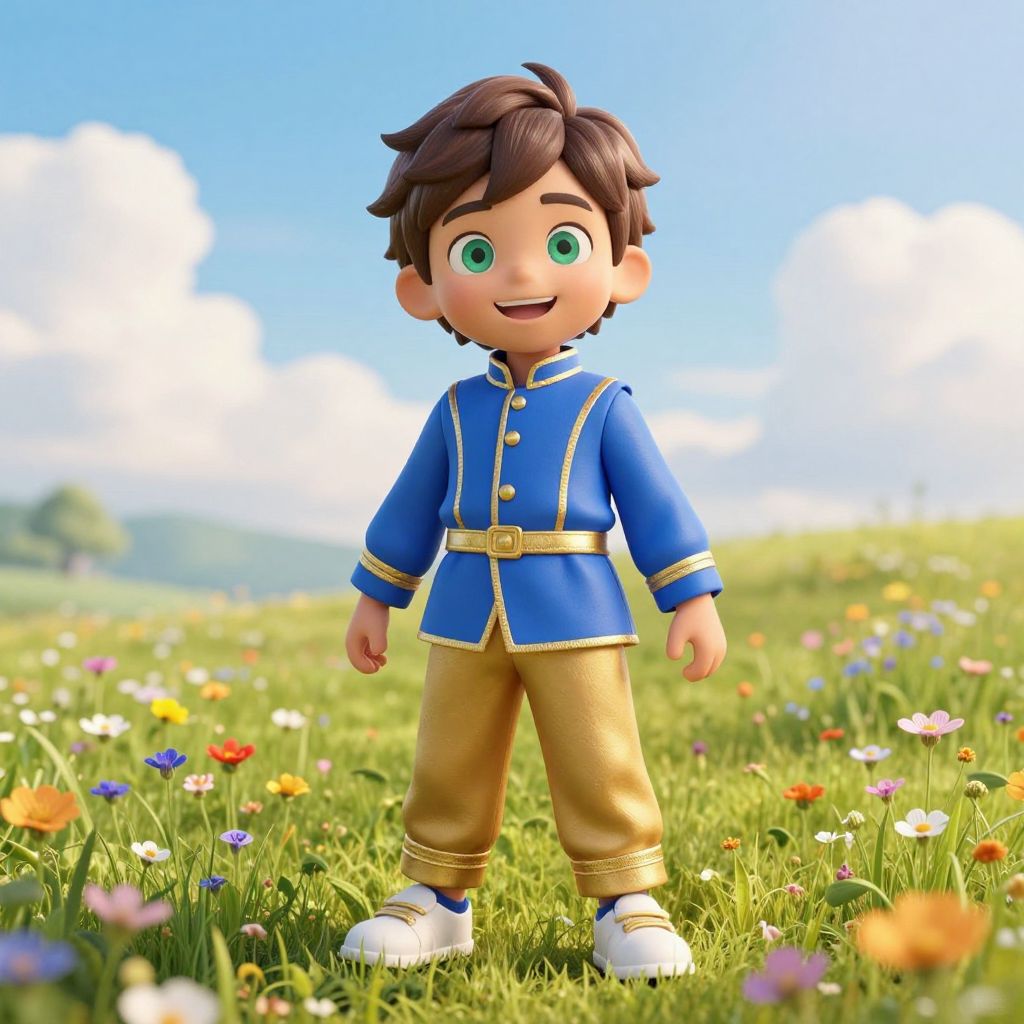 A young boy with short brown hair, bright green eyes, and a cheerful, wide smile, stands in a sunny meadow filled with vibrant flowers and blooming wildflowers. He wears a stylish blue and gold outfit featuring a crisp blue button-up shirt with elegant golden trim along the sleeves, collar, and waist, paired with golden pants that have subtle golden accents along the hem and cuffs, and white sneakers with small golden laces. The scene is set under a soft blue sky with fluffy, white clouds drifting gently in the background, casting a warm, golden-hour light across the meadow. The boy's expression radiates a lively, adventurous spirit, as if ready to explore the world with curiosity and joy, embodying innocence, energy, and a sense of wonder.
