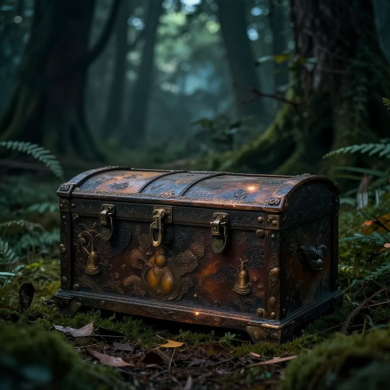 "Blending ancient chest hidden in the forest, magical, cinematic universe, hyper realistic, ultra detailed, magical,"