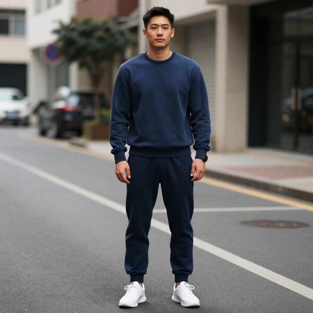 Joggers Business Casual, man standing on the street in a blue sweatshirt and pants