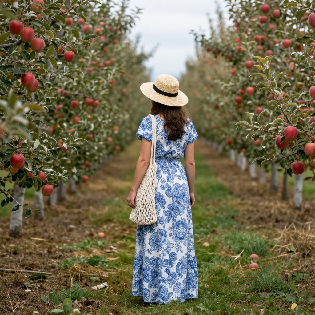 Woman standing amidst rows of apple orchards, wearing a blue and white floral maxi dress, a straw sun hat, and carrying a macramé bag, with vibrant red apples visible on the trees in the background.