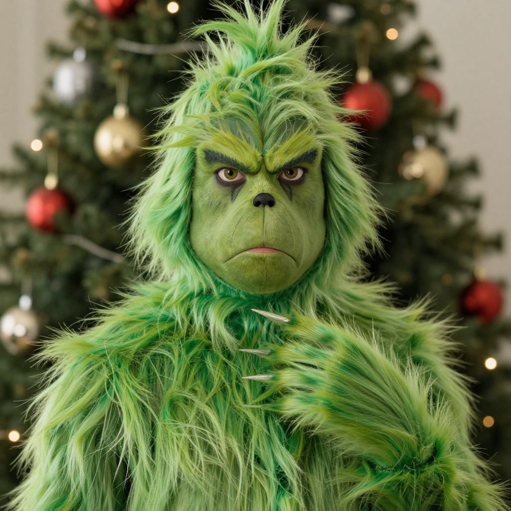 Grinch Movie Costume, a close up of a person in a costume standing in front of a christmas tree