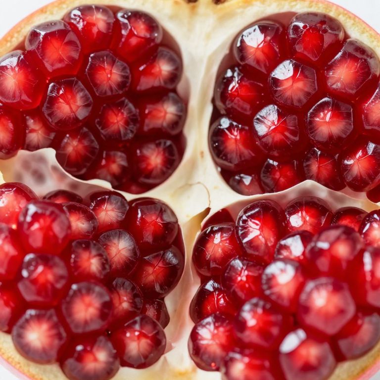 Focus on the clustered arrangement of pomegranate seeds within their membrane, capturing their jewel-like translucence and fractal organization, Use an ultra macro lens to highlight the repeating patterns of the seeds as they nestle within the fruit’s chambers, Soft backlighting enhances their vibrant red hues, creating a glowing, gem-like effect, Frame the shot to emphasize the radial symmetry of the fruit’s internal structure, with the seeds forming dense, self-similar clusters, A shallow depth of field isolates the seeds closest to the lens, while the surrounding patterns blur softly, This close-up transforms a familiar fruit into a study of fractal abundance and natural symmetry