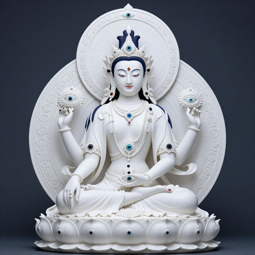 Photograph of a white, intricately detailed statue of a serene, seated deity with black hair, holding lotus flowers, adorned with jewels, set
