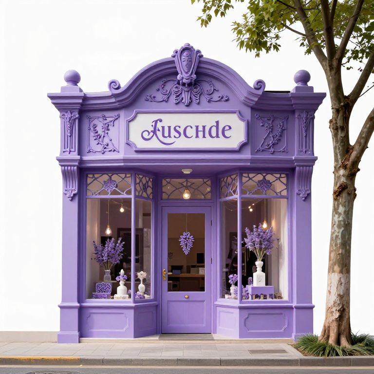 Photograph of a vintage-style, lavender-painted storefront with ornate details, named "Luscde," flanked by trees, featuring floral displays