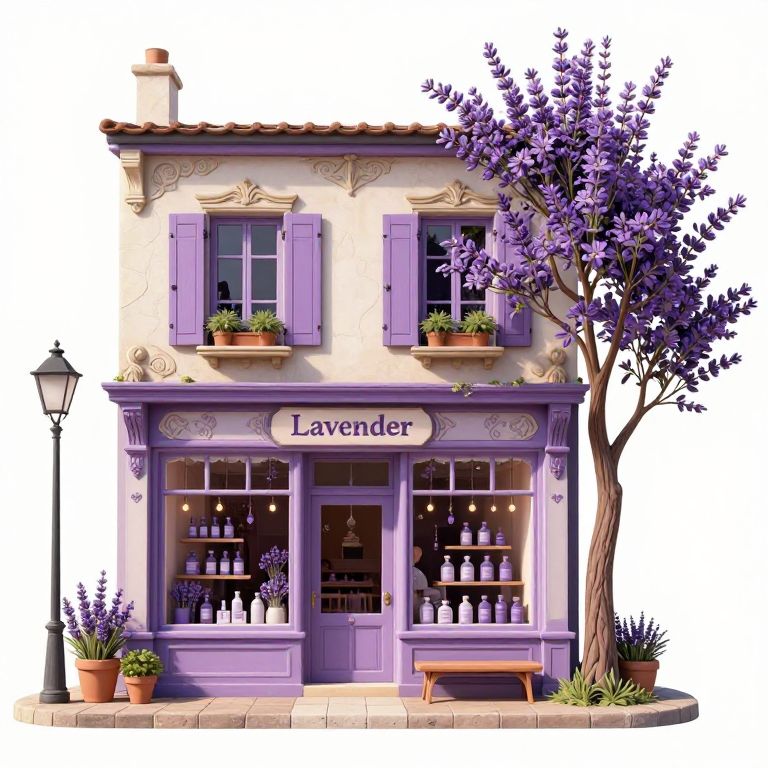 A charming, art nouveau-style lavender shop with purple accents and a tree in front, set against a white background.