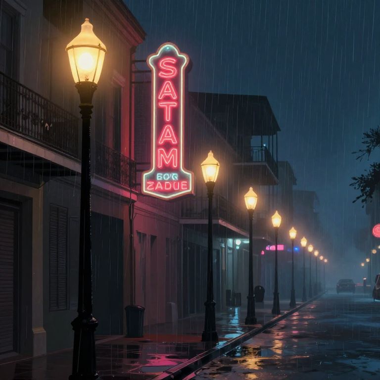 Row of sodium vapor street lights neon signs night street rain mist haze new orleans french quarter matte painting concept art artstation illustration by syd mead 4 k 8 k
