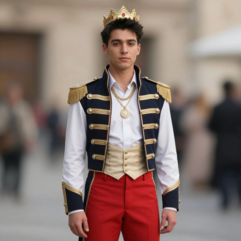 Photograph of a young man with olive skin and dark curly hair, wearing a gold crown. He is dressed in a white shirt, black and gold epaulette jacket with gold buttons, and red trousers. He has a gold necklace with a circular pendant. The background is blurred, showing a crowd of people in an outdoor urban setting. The image has a sharp focus on the man, highlighting his regal, formal attire. The lighting is natural, and the overall style is contemporary fashion photography.
