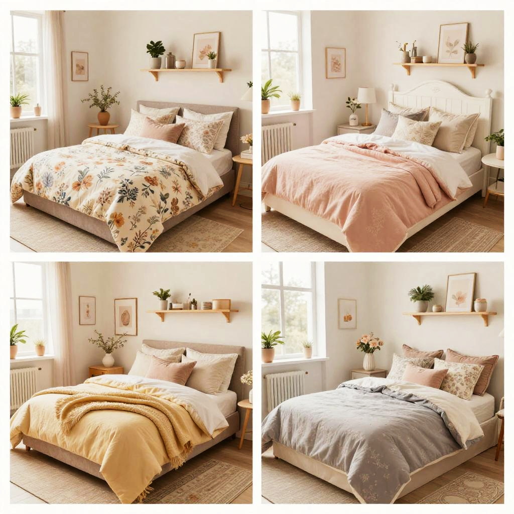 This collage of four photos showcases cozy, feminine bedrooms in soft, pastel tones. Each room features a bed with floral or patterned bedding, soft lighting, and decorative touches like shelves, pillows, and plants. The top-left room has a floral duvet and a small table, while the top-right has a pink blanket and white headboard. The bottom-left features a yellow blanket, and the bottom-right has a gray duvet and a window with white frames. The overall style is warm and inviting.
