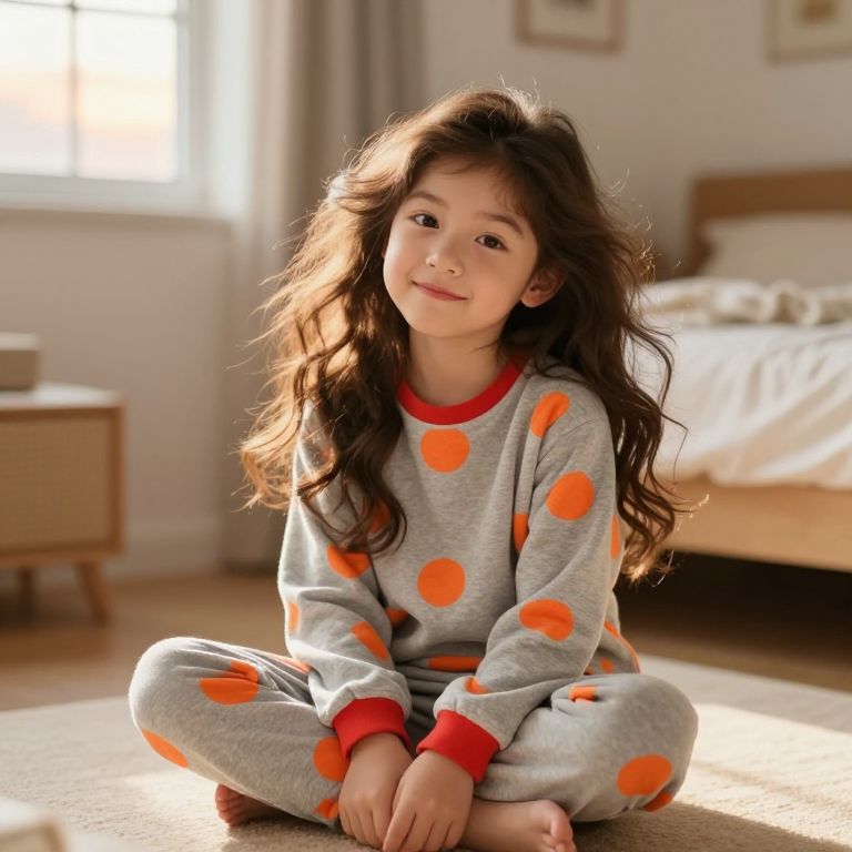 A cute girl with long, flowing brown hair, soft and naturally wavy, sitting on a cozy bedroom floor wearing a comfortable grey pajama set with bright orange circular patterns and a red collar. The lighting is warm and soft, casting gentle shadows, with a cozy, homey atmosphere. She has a playful expression, looking slightly amused, with a small smile, and the background features a gently illuminated room with a window showing a soft sunset outside.