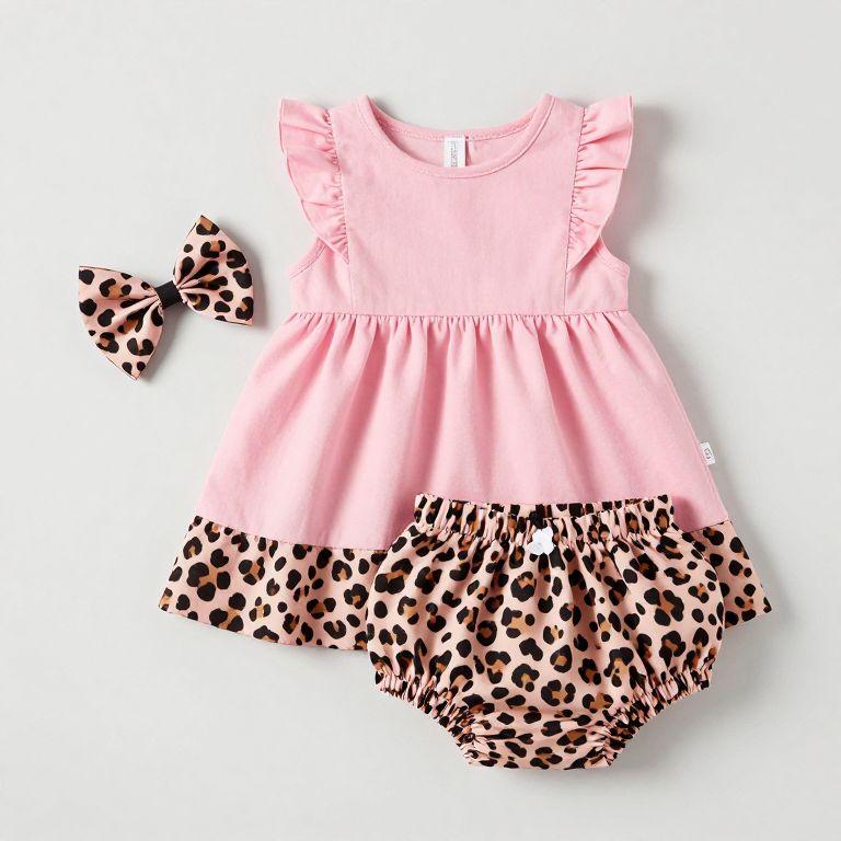 Lilybird Infant Girl's Pink Cheetah Dress and Bloomer Set showcases a charming ensemble featuring a sleeveless pink dress with ruffled shoulders paired with matching cheetah-print bloomers and a coordinating bow accessory placed to the left.