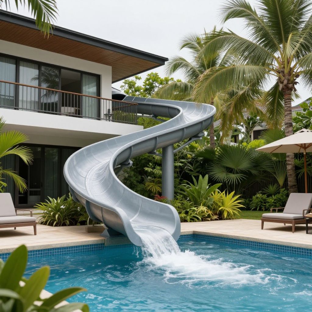 A futuristic waterslide elegantly curves from the second-floor terrace of a modern mansion, seamlessly merging into the tranquil pool below, creating a gravity-defying aquatic escape amidst lush tropical greenery.