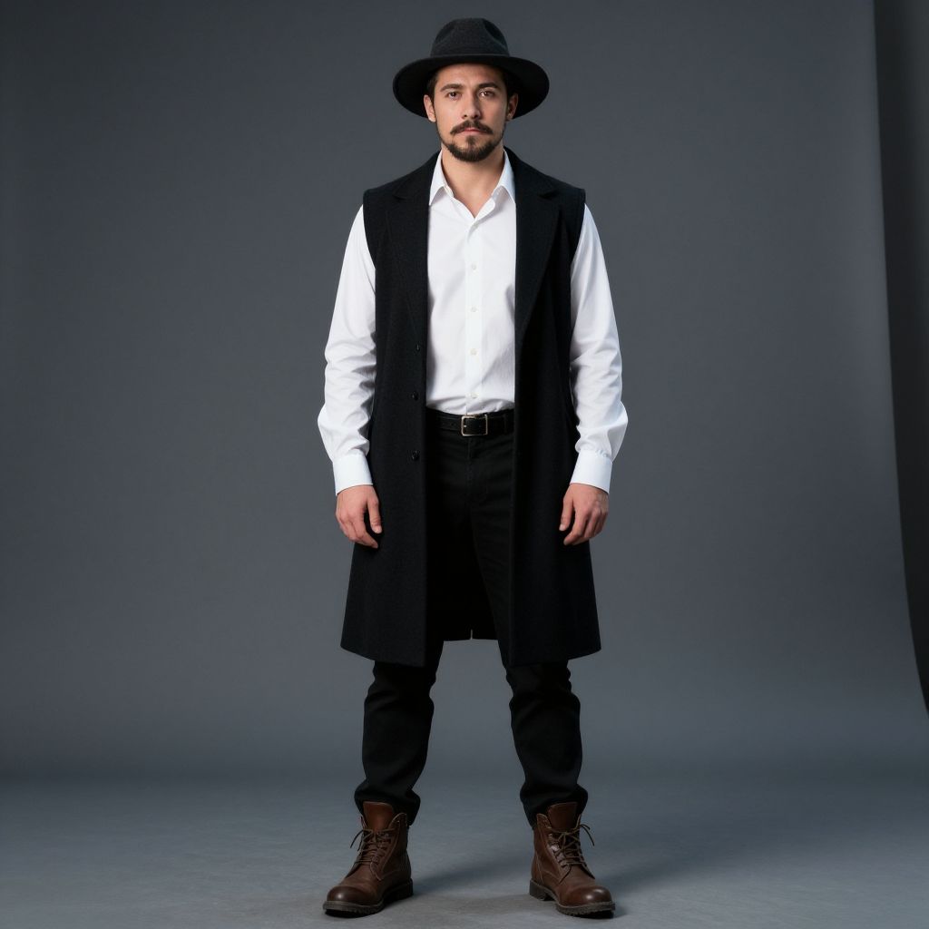 "movie inspired costume man, 1boy, male focus, solo, facial hair, boots, hat, shirt, full body, standing, coat, pants, beard, white shirt, belt, mustache, black pants, long sleeves, brown footwear Realistic photo of casual sexy person with pretty face"