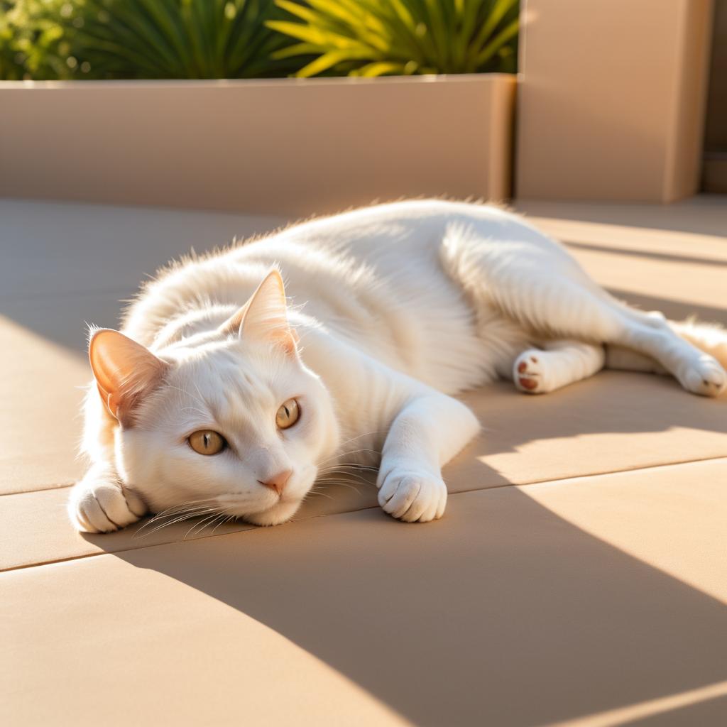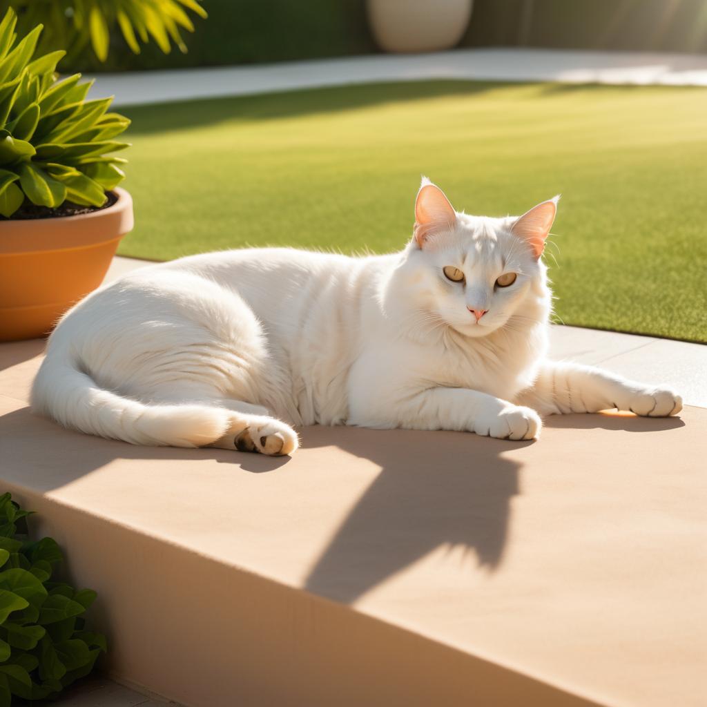Elegant white cat with golden eyes lying in natural sunlight on a beige surface outdoors. The scene features soft, natural lighting that highlights the cat's fur texture and peaceful demeanor. Background includes green artificial turf and potted plants, creating a serene garden setting.