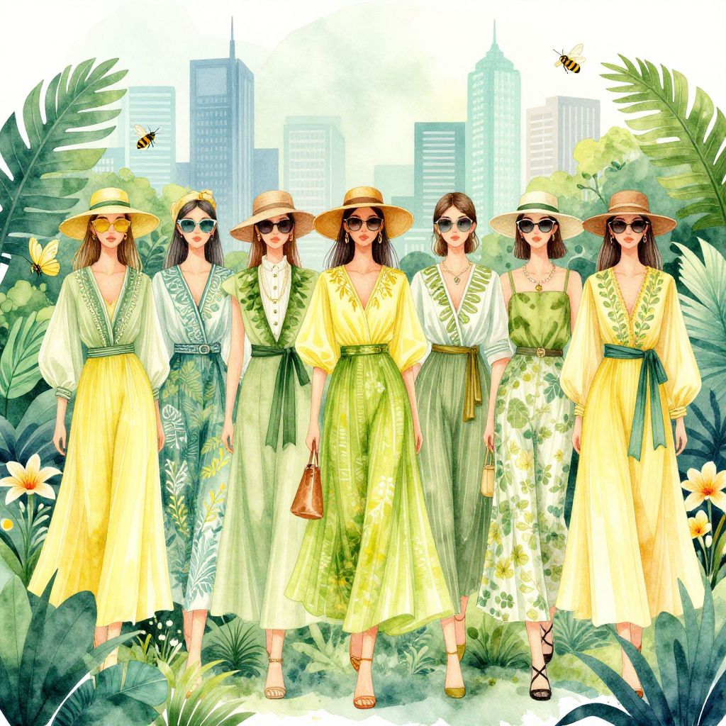 Watercolor fashion illustration showcasing five models dressed in vibrant green and yellow garments blending nature-inspired designs with cityscape elements. The background features a stylized urban jungle with tall skyscrapers, large tropical leaves, flowers, and butterflies. The models wear hats and sunglasses, embodying a modern, elegant look merged with organic motifs, surrounded by bees and flora imagery.