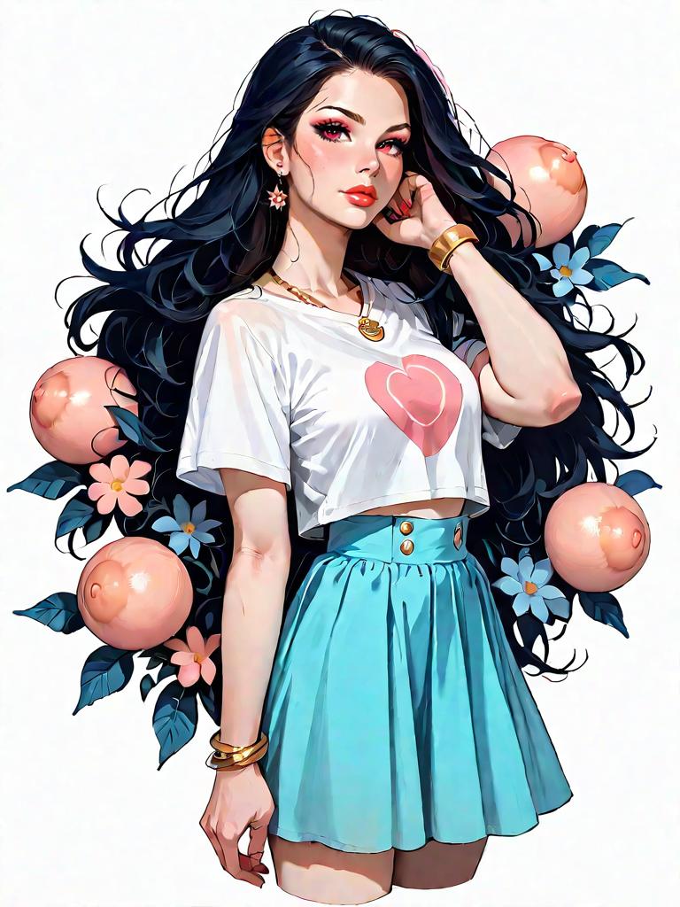 Digital artwork of a woman with long black hair wearing a white cropped t-shirt with a heart design and a high-waisted peach-colored skater skirt. She accessorizes with gold pendant necklace, gold bangles, and floral earrings. The background features stylized peach fruits and flowers on white backdrop.