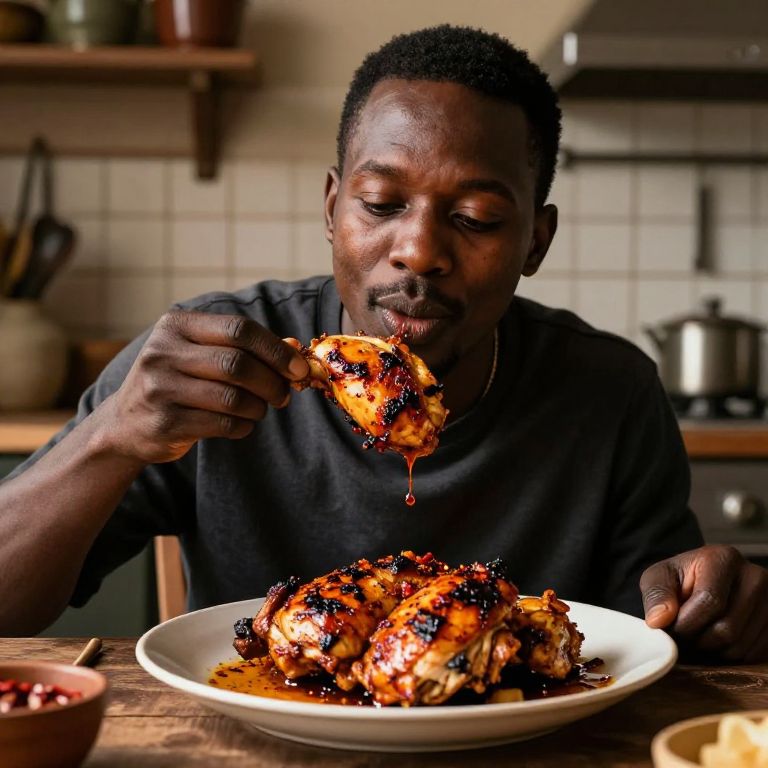 Photograph of a dark-skinned man with short, curly black hair, wearing a black t-shirt, sitting at a wooden table in a kitchen. He is holding a piece of crispy, caramelized chicken close to his mouth, with a focused expression. In front of him on the table is a white plate filled with more glazed chicken pieces. The background includes a tiled wall, wooden shelves with kitchen items, and a silver pot on a stove. The lighting is warm, highlighting the rich, sticky glaze on the chicken. The image has a slightly high-contrast, vibrant style, emphasizing the textures and colors.