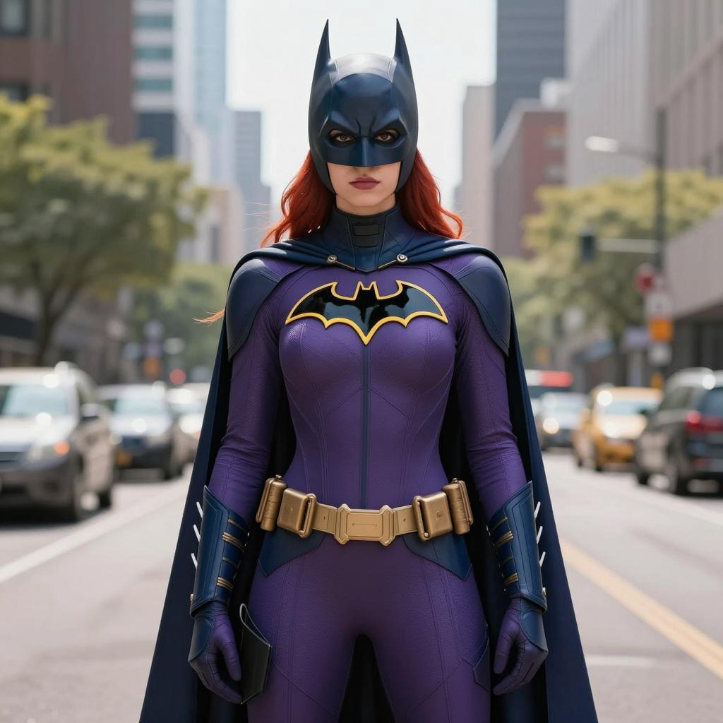 Photograph of a woman wearing a black Batgirl costume featuring a leather material suit with a yellow bat emblem on the chest, a matching yellow utility belt, and a black cape. She has long brown hair, a serious expression, and a black batmask covering the upper part of her face. The photo is taken outdoors during the daytime with a blurred background including trees, people, and a blue tent, creating a realistic superhero portrayal inspired by DC Comics.