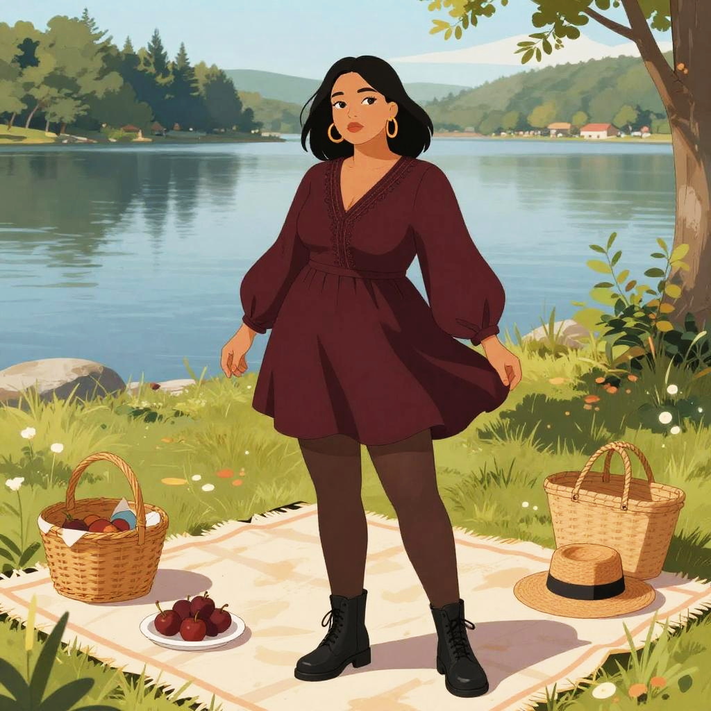 A Curvy woman in a casual bohemian burgundy mini dress with long sleeves and a flowy skirt, sheer black tights, and black ankle combat boots, enjoying a tranquil lakeside picnic spot, illustrated in the visual style of Titan Books. Sexy. Pretty face and beutiful eyes