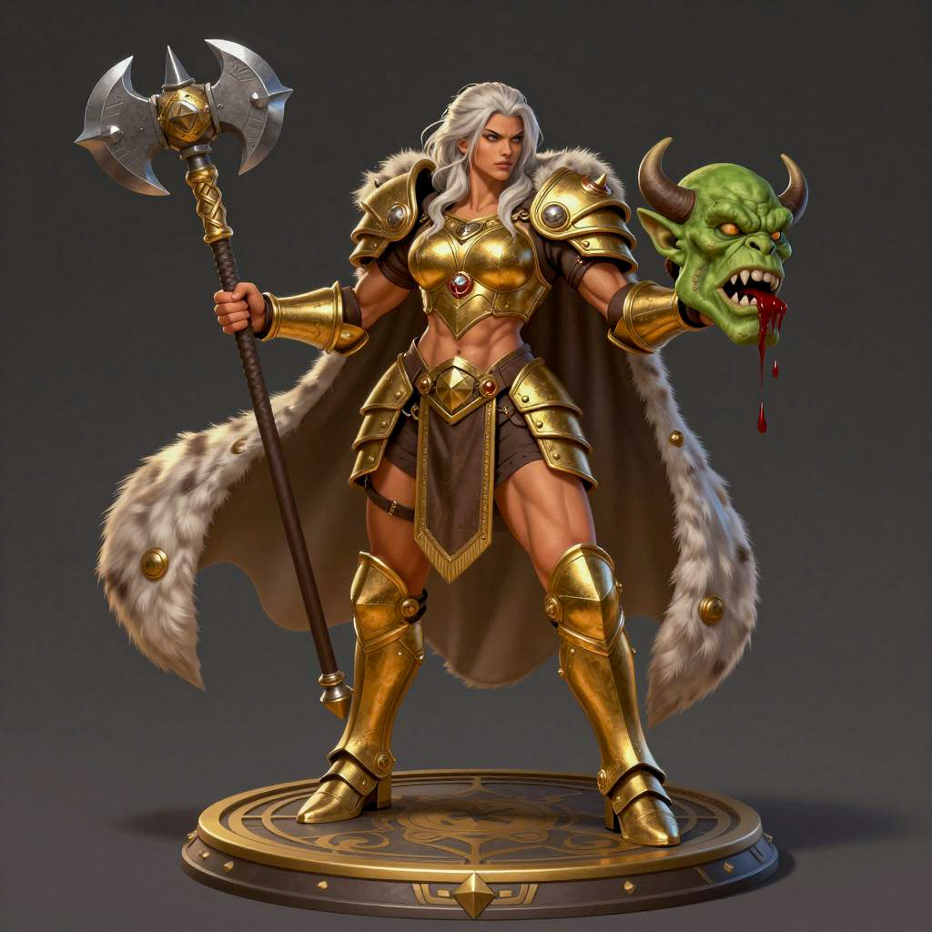 Digital illustration of a muscular female warrior with long brown hair wearing fantasy armor featuring black leather and red plates with gold accents. She has a grey hood, red cape, and stern expression, holding a long golden spear in her right hand. The character stands firmly on a round stone base against a dark grey background. The outfit includes a black crop top, leather pants with red armor plates, and gold sandals.
