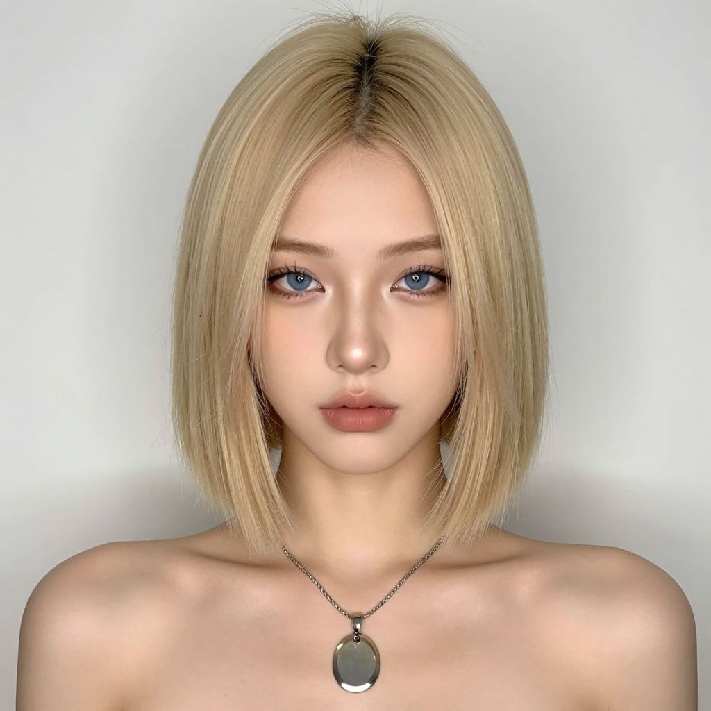 This digital CGI portrait features a young woman with fair skin and striking blue eyes. She has straight, shoulder-length blonde hair with a slight part in the center. Her facial features are symmetrical, with a small nose, full lips, and subtle makeup highlighting her eyes and lips. She wears a simple silver necklace with a round pendant. The background is a plain, soft white gradient, emphasizing her face and upper shoulders, which are bare. The image has a realistic, yet slightly stylized appearance, with smooth textures and soft lighting.
