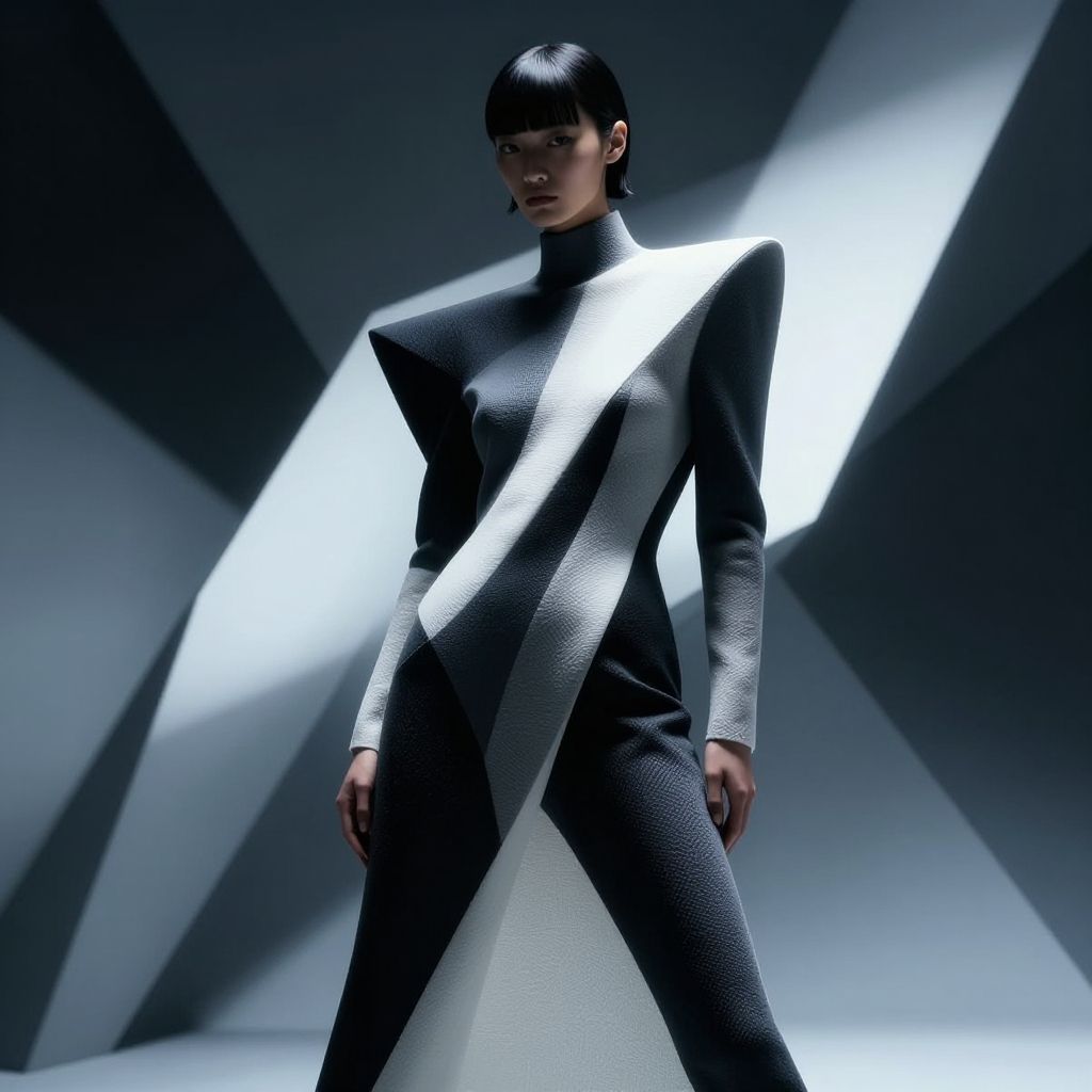 1girl, Textured garments, poised poise, dramatic angles, geometric shapes, contrasts of light and shadow, slick futurism, avant-garde styling, high-tech backdrop, crisp lines, ultra-high resolution
