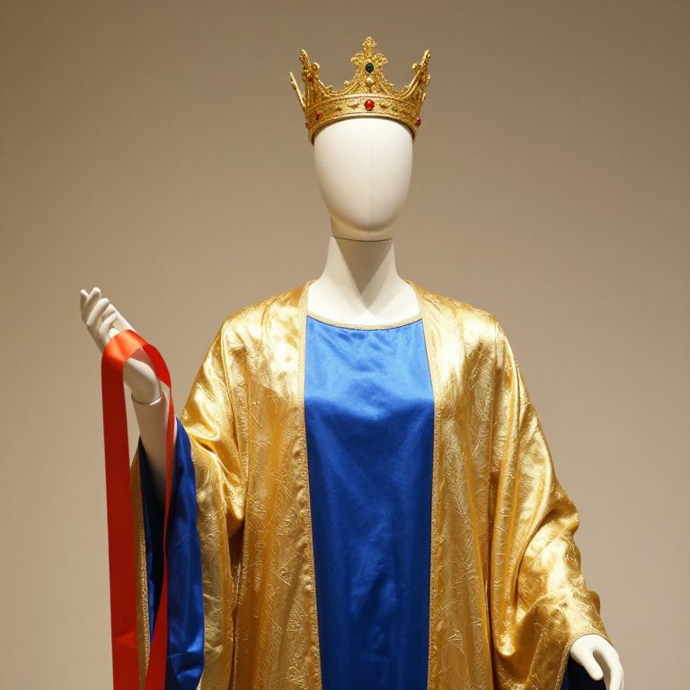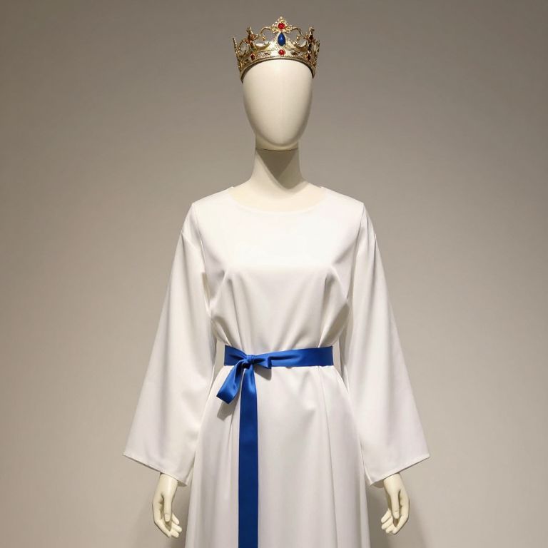 Mannequin wearing a white robe with a blue sash and a crown on his head.
