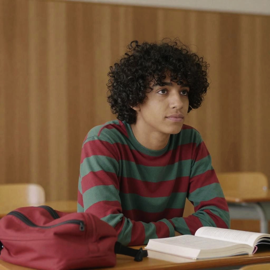 Photograph of a young person with curly black hair, wearing a striped red and green long-sleeve shirt, leaning on a wooden desk in a classroom. A red backpack and a book are on the desk. Background has vertical wooden panels. Person looks slightly to the right with a neutral expression.