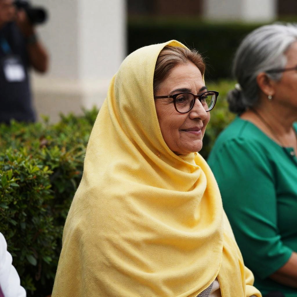 Photograph of a middle-aged woman with light skin, brown hair, and glasses, wearing a yellow headscarf and gold earrings, smiling. She is topless, with her back to the camera, sitting beside a woman with gray hair in a green blouse. Background includes green bushes and a white pillar. A man with a camera is partially visible on the left.