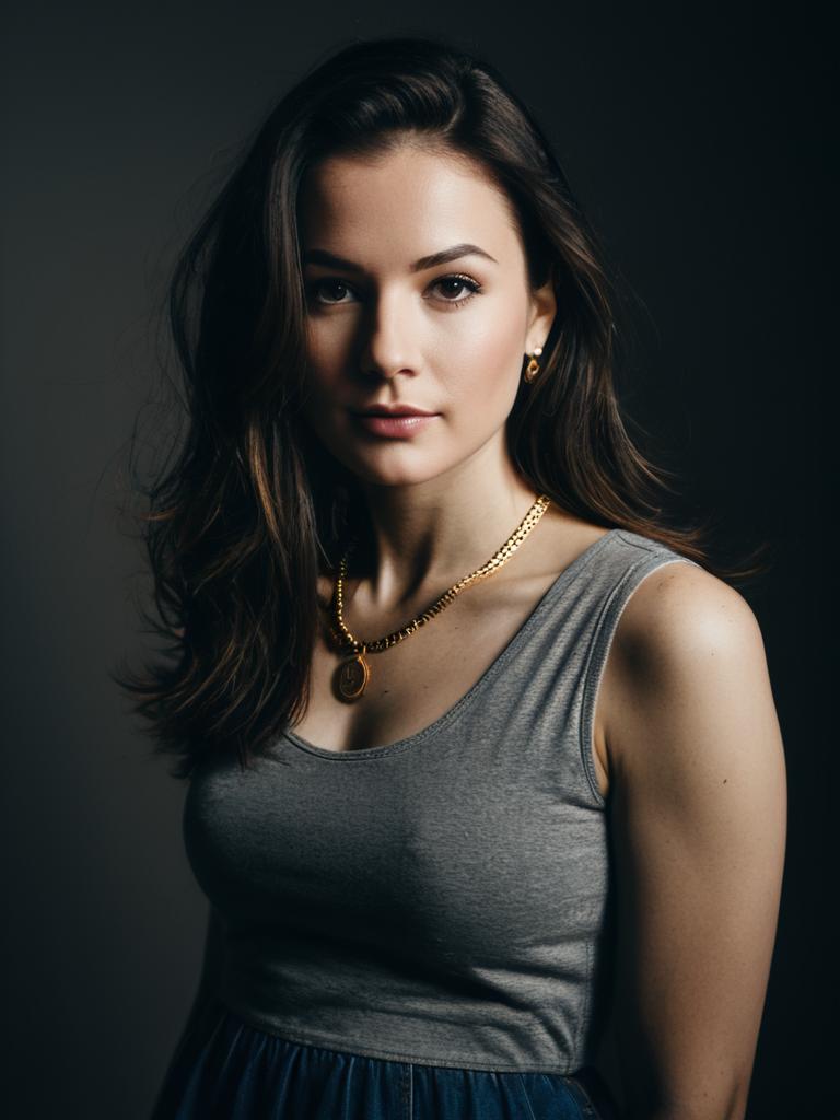 Close-up portrait of a woman wearing a textured coral halter top paired with distressed boyfriend jeans and a brown leather belt with a gold buckle, standing against a dark studio background. She has wavy brown hair and a serious expression, showcasing a stylish and casual look.