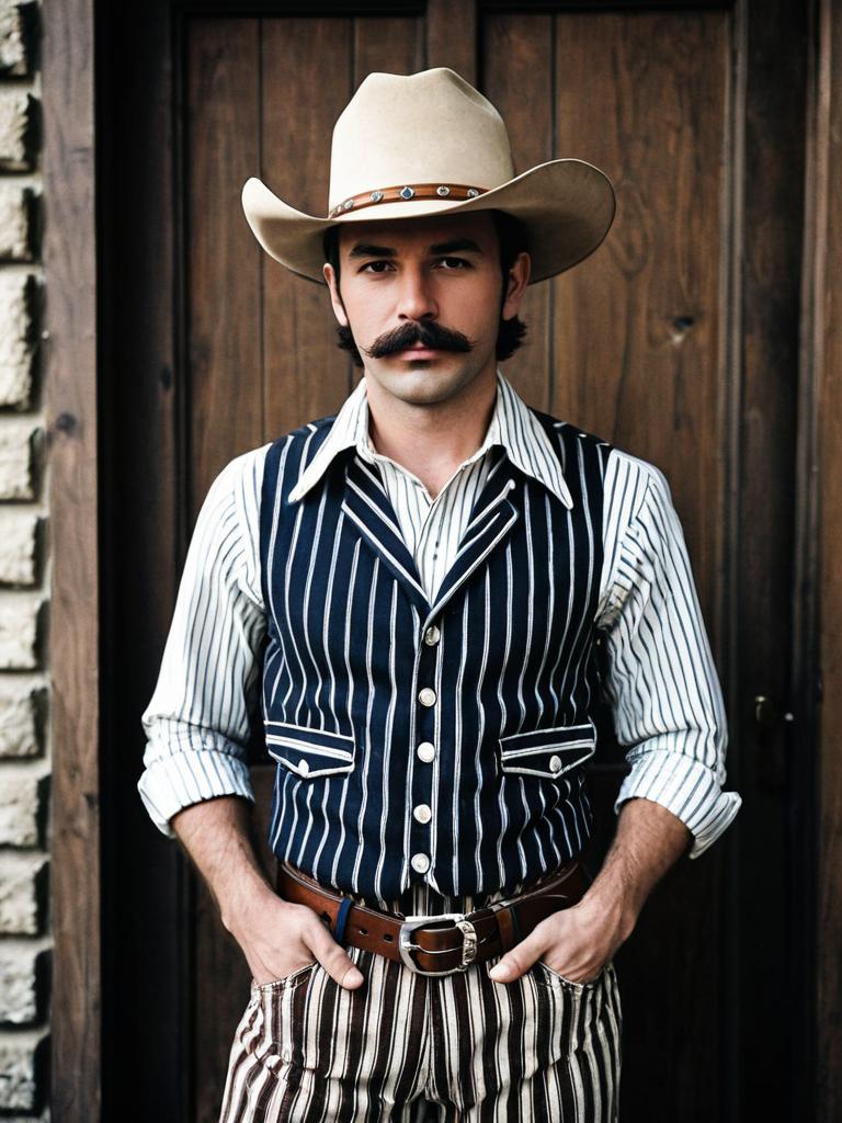 American attire male costume, 1boy, male focus, solo, hat, pants, facial hair, shirt, belt, striped pants, vest, cowboy hat, brown belt, white shirt, hands in pockets, striped clothes, looking at viewer, mustache, collared shirt, cowboy western, cowboy shot, standing, vertical-striped pants, realistic, closed mouth, jacket, buttons, belt buckle, black hair, blurry