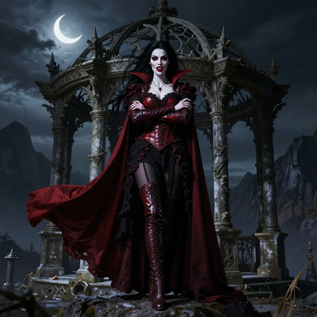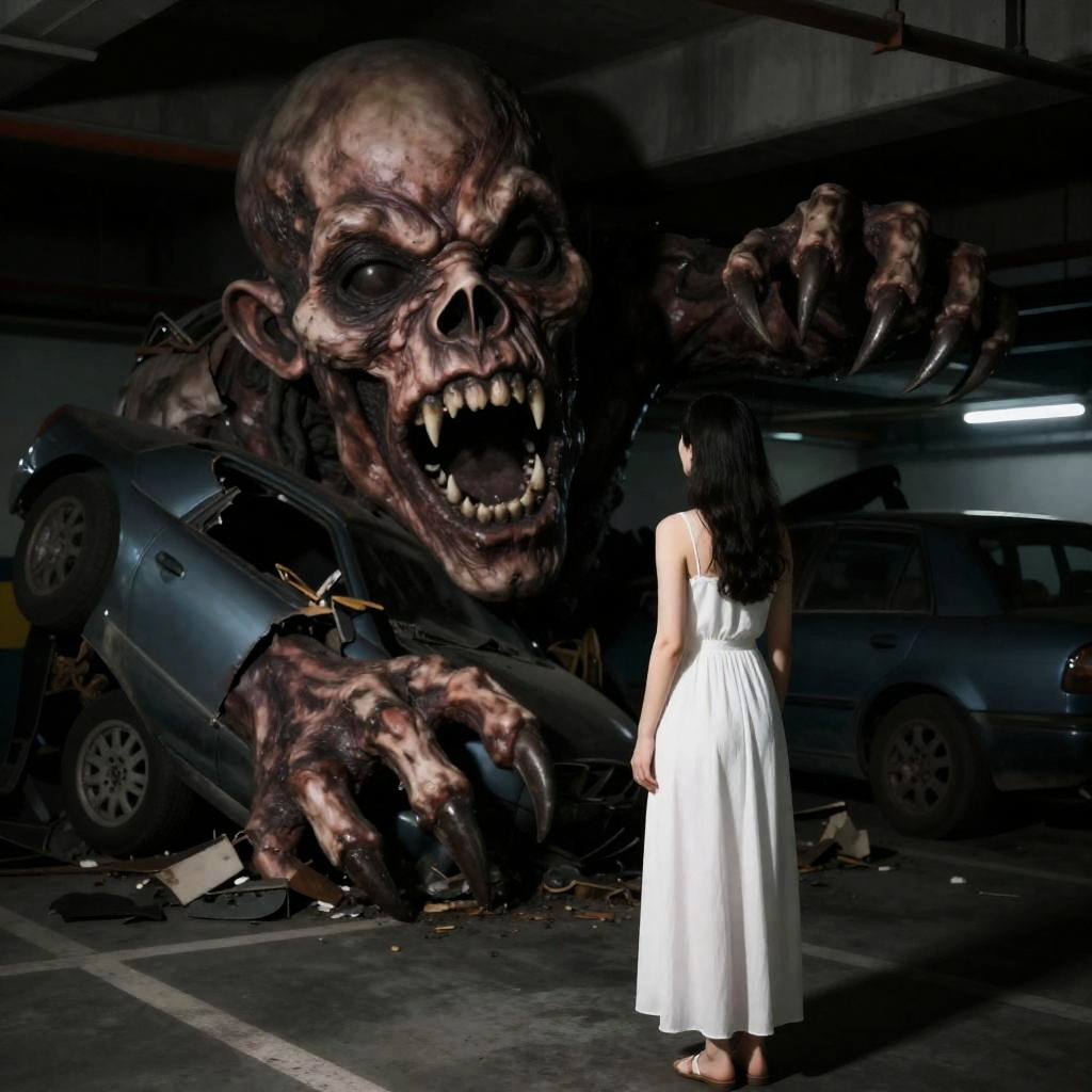 Illustration of a woman in a white dress with a high slit, standing with one hand on her hip, looking to the right. Behind her is a large, menacing, black-faced monster with glowing eyes and sharp teeth, drooling. In the background, a full moon illuminates a castle and village. The monster's face is centered, dominating the upper half. The woman is on the right, smaller in size.