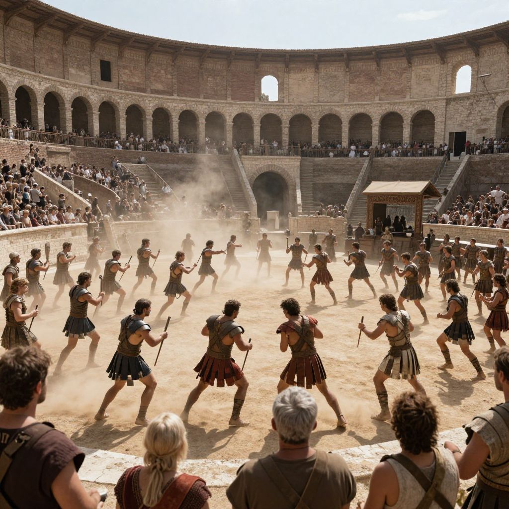 5th century Rome gladiator arena crowded with spectators, intense combat scene, detailed Roman architecture, dust and sunlight effects, cinematic and dynamic composition