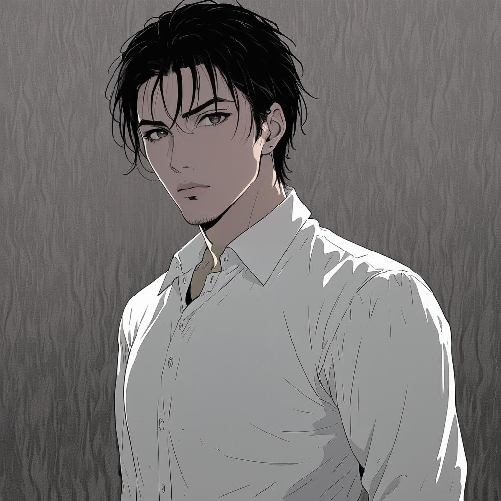 This digital drawing in a semi-realistic anime style features a young man with wet, dark black hair and light skin, gazing intently forward. He wears a white, long-sleeved, button-up shirt that is slightly wrinkled and wet, adding texture. The background is a textured, grayscale gradient, enhancing the contrast with his shirt and hair. His expression is serious and somewhat aloof, with dark, slightly arched eyebrows and subtle shadows under his eyes. The lighting highlights his face and upper body, creating a dramatic effect. The overall mood is intense and somewhat melancholic.