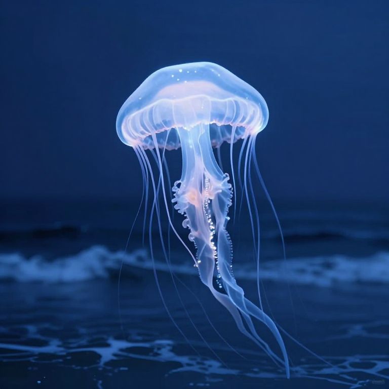 An ethereal jellyfish of liquid moonlight drifts serenely above the Pacific, its luminescent tendrils weaving dreams into the rhythmic dance of the waves, evoking a profound sense of wonder and the timeless mystery of the cosmos.