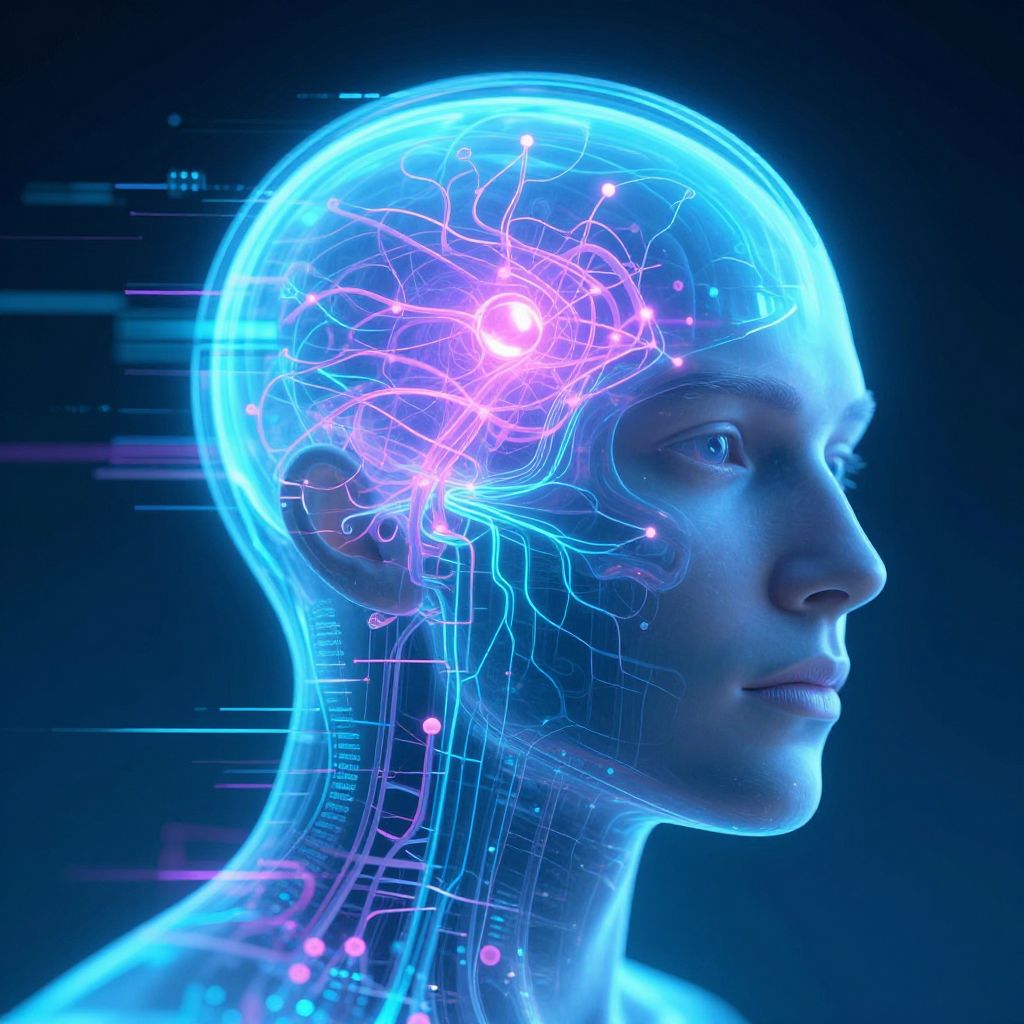 Neuro futuristic portrait blending human features with transparent layers revealing complex neural circuits and luminous synapses inside the skull, enhanced by digital glitch effects and a palette of cool cyan and magenta hues, illustrating the fusion of biology and technology.