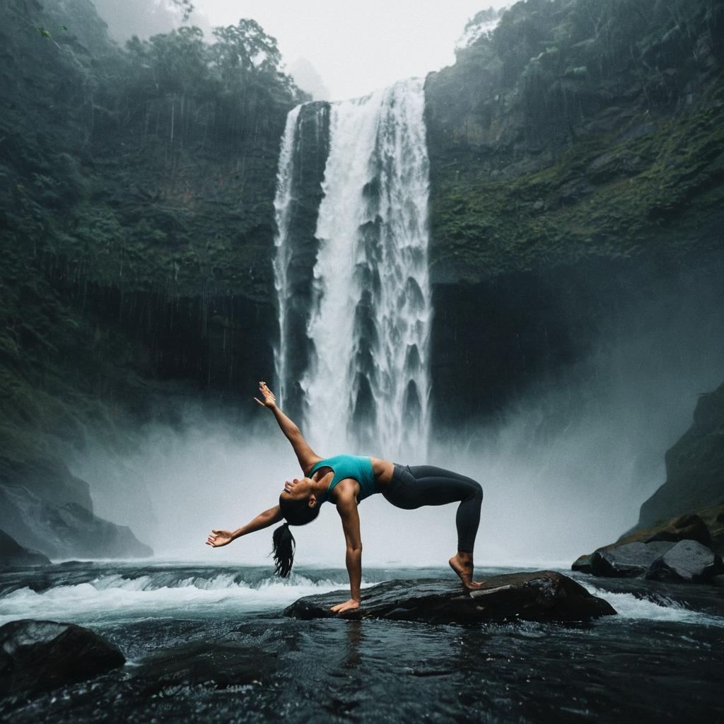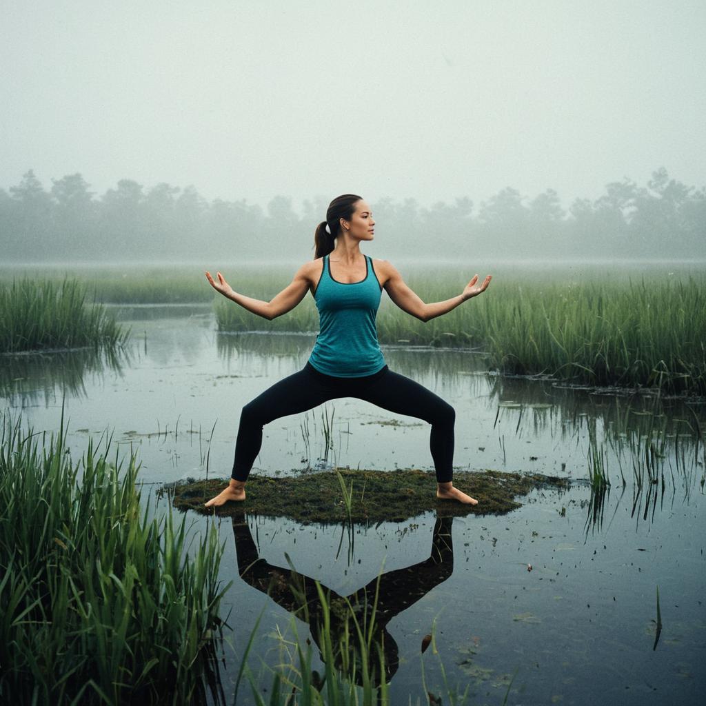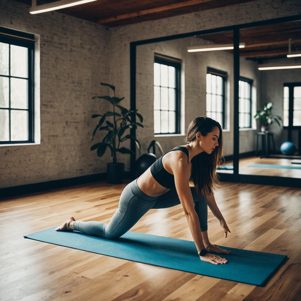 Dissolve a woman doing a yoga pose in a rooftop garden, by Liam Carter, #89CFF0, #FFD700, fitness-themed captions, detailed and textured.