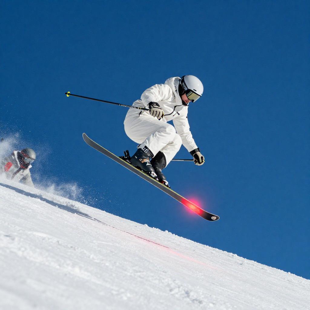 Photograph of a snowy mountain slope with three snowmobiles ascending diagonally from the bottom left to the top right. A green and white helicopter with an orange nose hovers in the bright blue sky on the top right. The snowmobiles are black, and the helicopter's rotor blades are partially visible.