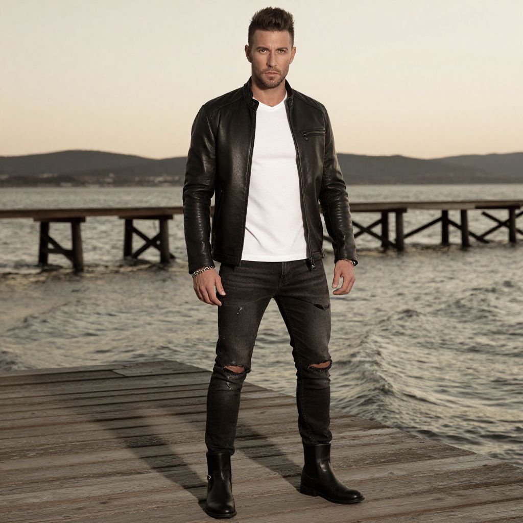 A man, leather blazer in black, fitted white t-shirt, distressed skinny jeans, black leather ankle boots, silver chain bracelet, rustic wooden docks, gentle waves lapping, sunset over distant hills, sepia effect, confident expression. Man has masculine face and piercing eyes
