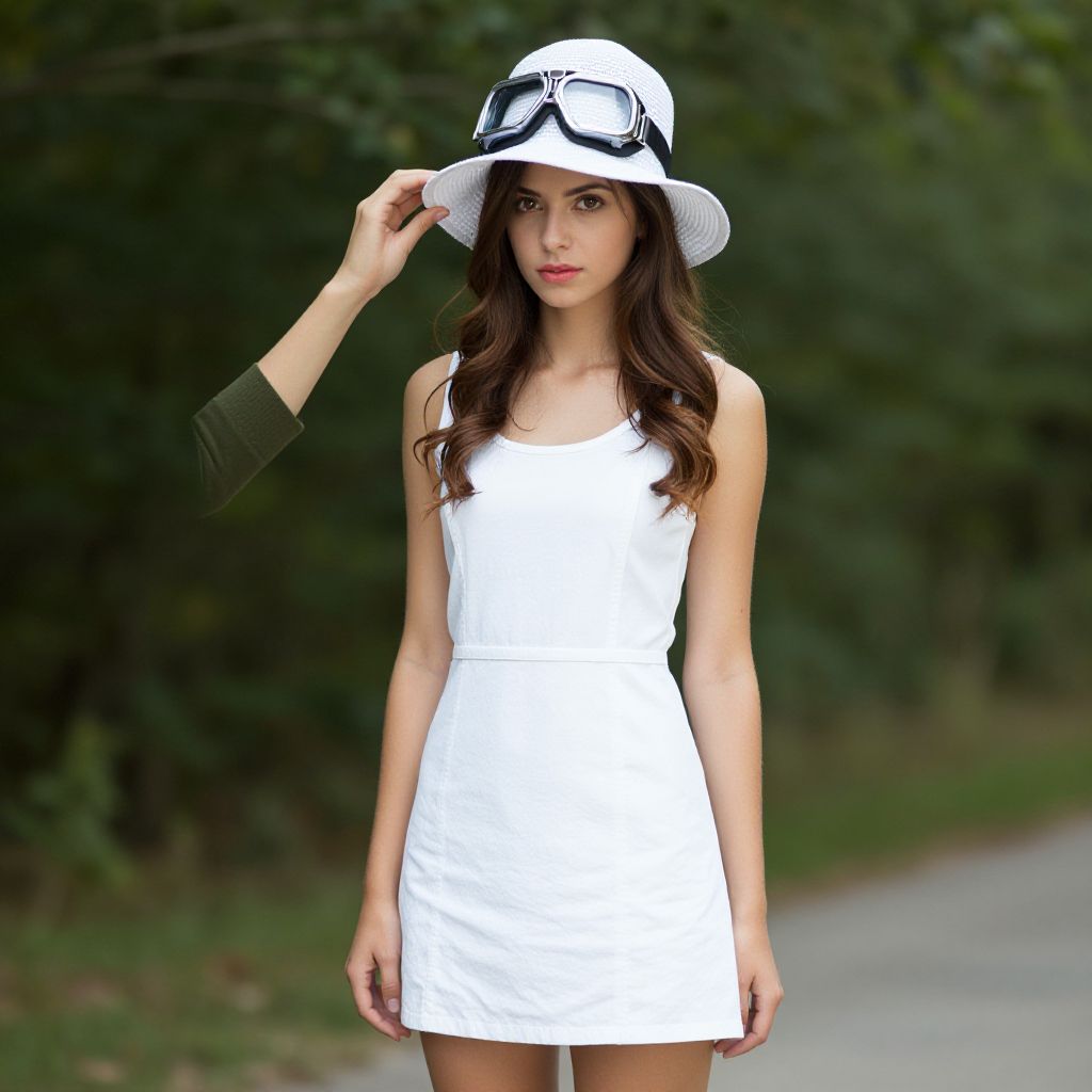 "White Trash Outfit Woman, woman in white dress and hat with goggles on her head"