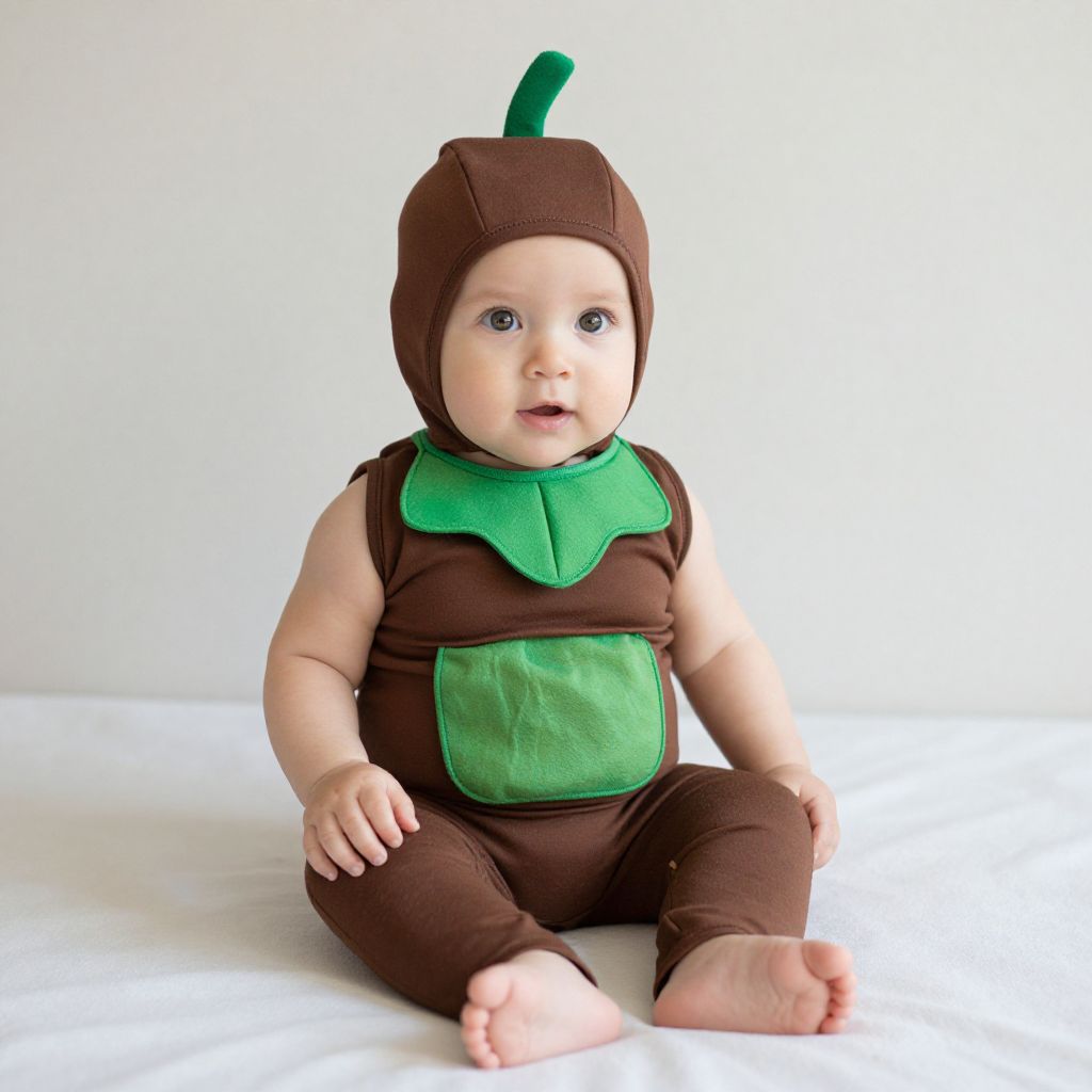 Photograph of a chubby, fair-skinned baby with blue eyes sitting on a white surface. The baby wears a brown and green onesie with a green collar and a small green stem on the hood. The onesie has a green patch on the front. The baby's feet are bare, and their hands rest on their thighs. The background is a plain white wall, creating a bright and clean setting. The baby's expression is curious, with slightly parted lips. The image is well-lit, highlighting the baby's soft skin and the textures of the onesie.