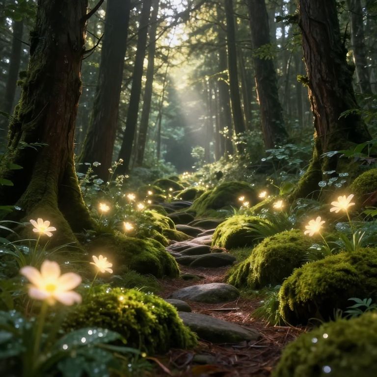 Beautify an ancient forest path with glowing magical flowers, shafts of sunlight breaking through tall trees, soft moss covering rocks, sparkling dewdrops on leaves, enchanted and ethereal ambiance, rich textures, hyper-realistic style.
