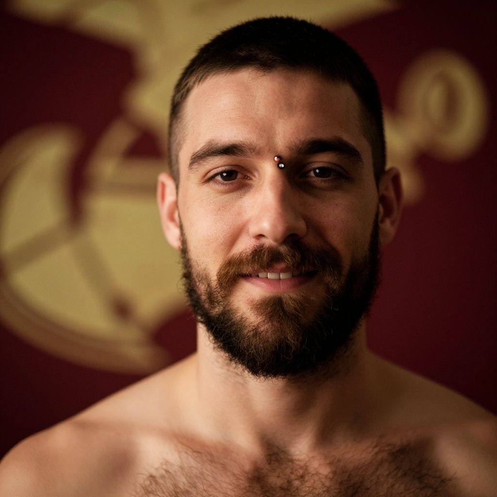Cinematic photo hot bearded man, POV, looking at viewer, 35mm photograph, film, bokeh, professional, 4k, highly detailed, extreme close up photo, eyebrow piercing, hairy chested Italian man, shirtless, smile, marines